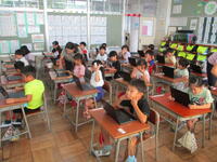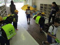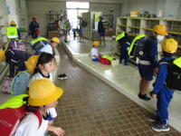 企画委員会の東っ子が今日も下校の案内の放送をしています。東っ子たちは、予定されていた学習や諸活動を終えて校庭に登下校班ごとに集合しました。