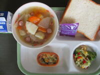 今日の真岡東小学校の給食は、国産野菜のグラタン、カラフルサラダ、ポトフ、ミルク食パン・ブルーベリージャム、牛乳のメニューで、657Kcal(中学年)でした。