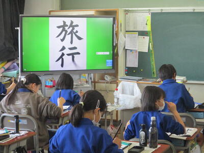 今日は書道で「旅行」の文字を書いていました。電子黒板を使って、書き方の見本を動画で見ることもできています。
