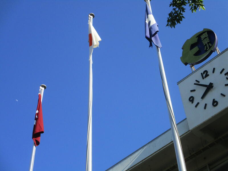 きれいな青空を背景に、真岡東小のシンボルの時計台と国旗、市旗、校旗、そしてまっすぐに飛んでいく飛行機です。