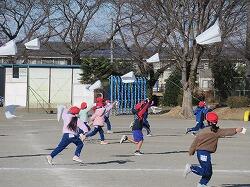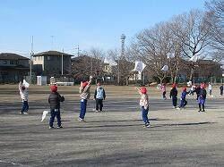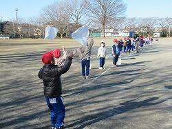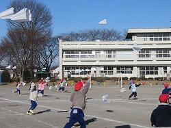 <1年1組> 生活科の昔遊びの一環で、たこあげをしていました。今日は少し風があり、少し走るだけでたこがよく上がりました。みんな大喜びで、校庭を何度も行き来していました。
