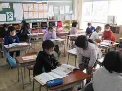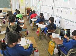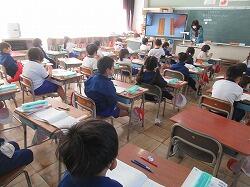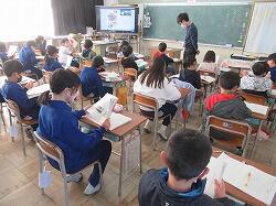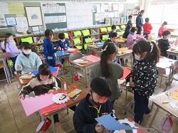 <日本語教室> 今日は、新採研修の一環で、日本語教室指導の示範授業が行われました。日本語指導助手も交えた授業で、言葉の仲間分けと短文作りを行いました。いつもと違い児童は緊張気味でしたが、頑張っていました。