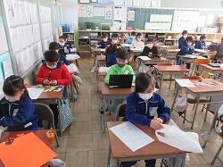 <1年2組> 国語の「子どもをまもるどうぶつたち」という説明文の学習でした。タブレットの資料を使って、ハシビロコウ、ツバメ、ペンギンの子供を守る知恵について調べていました。タブレットの資料に書き込んでいました!