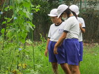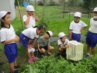 今日も学校農園で栽培している野菜の収穫をしている東っ子たちもいます。今日は学校農園の近くで"バッタ"を見付けた東っ子もいました。