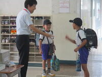 1年生の東っ子が朝の昇降口で係活動をしていました。