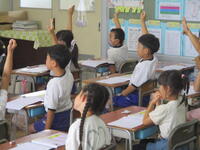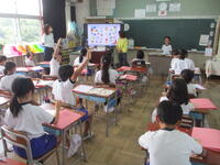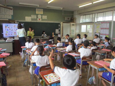 今日はいろいろな色を英語で答える練習などをしていました。1年生の東っ子たちは、とても反応よく積極的に楽しそうに学習に取り組んでいました。
