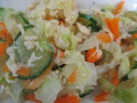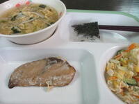 今日の真岡東小学校の給食は、アジの南蛮風味焼き、ササミと野菜のサラダ、かみなり汁(きざみのり)、ごはん、牛乳のメニューで、575Kcalでした。575Kcalは今月のメニューでは一番少ない数値です。