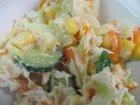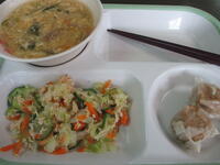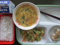 今日の真岡東小学校の給食は、肉しゅうまい、バンバンジーサラダ、中華風コーンスープ、ごはん、牛乳のメニューで、670Kcal(中学年)でした。