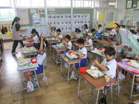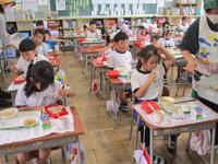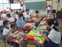 6年3組の東っ子たちは、「給食おいしーです!」「かみなり汁もおいしいです。」などと言いながら、今日もとてもおいしそうに給食を食べていました。