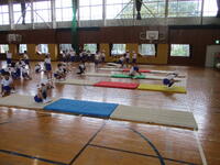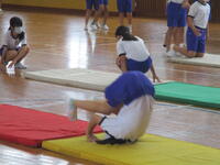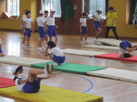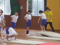 4年生の東っ子たちは、体育館でマット運動をしていました。みんなで協力してマットを準備して、先生の説明を聞いた後で、前転や開脚前転などに一生懸命に取り組んでいました。