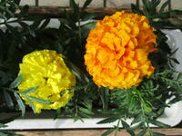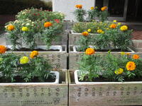 真岡東小学校の玄関前のプランターには、黄色とオレンジ色のマリーゴールドが大きな花を咲かせています。