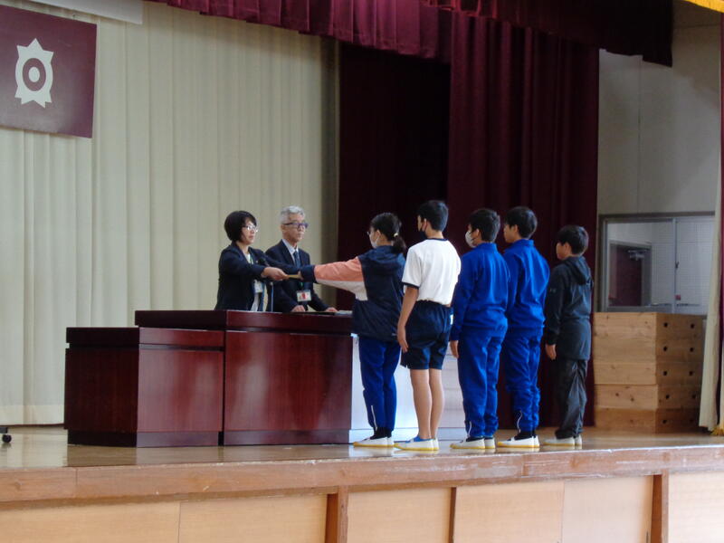 学業や学校生活などにおいて模範となる児童の表彰を行いました。大きな声で返事をし、立派な態度で賞状を受け取ることができました。