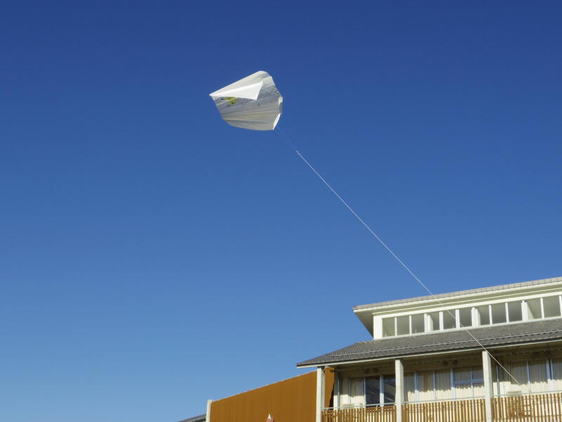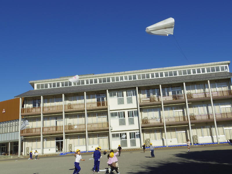 東風にのって、はたまた、子供たちの走りによる風によって、凧が青空に上がっていました。