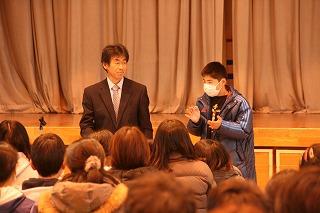 続いて表彰伝達。郡市バスケ1年生大会優勝。代表:青木 陽汰君