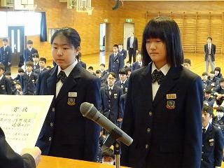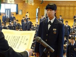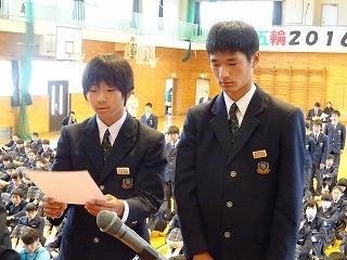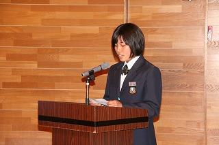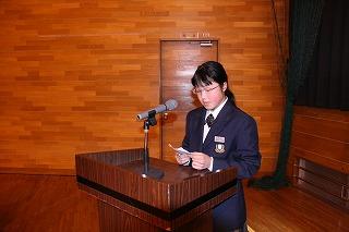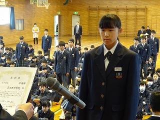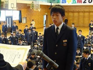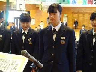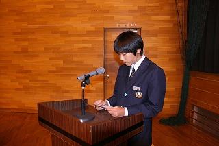 来賓の方々の祝辞に続き、生徒会長の鈴木海聖くんの「励ましのことば」が新入生に