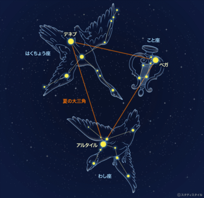 ちなみに、天の川に輝くこと座のベガが織姫で、わし座のアルタイルが彦星です。この2つの星と白鳥座のデネブを結んだものが「夏の大三角形」と呼ばれ、夏の星座を探す目印になっています。