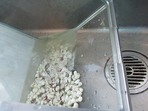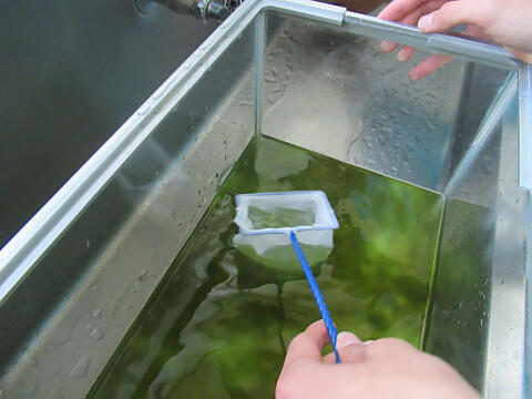 大きな水槽から、先ほどの小さい水槽にメダカを移動します。