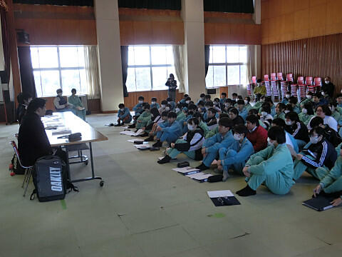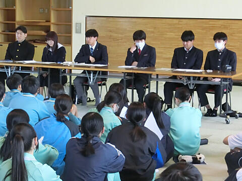 2年生の行事で「先輩に聞く会」が行われました。本校の卒業生で高校を卒業した先輩に各高校の様子や受験勉強のアドバイス、高校の勉強の厳しさや部活との両立の大変さなどを話していただきました。