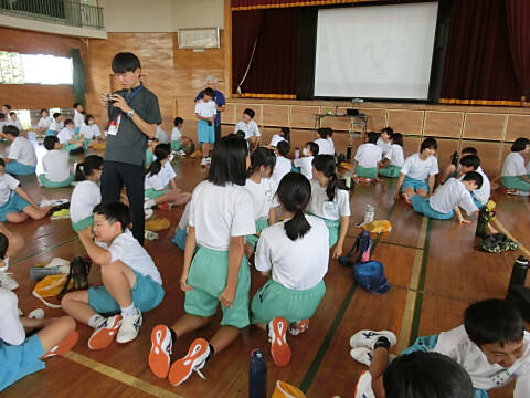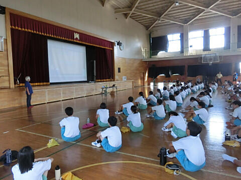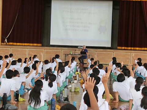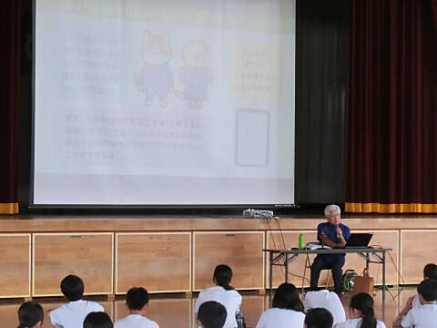 6校時に体育館で薬物乱用防止教室が行われました。スクリーンに分かりやすくポイントを示してくださり、動画でさらに理解を深めることができました。