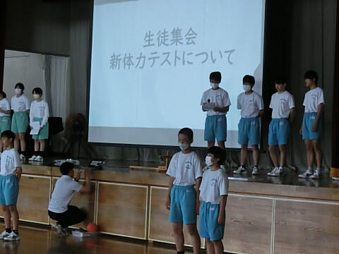 今朝は、体育委員会主催の生徒集会が行われました、6月に行われる新体力テストの西中生徒の課題説明が行われました。