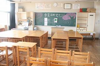 机・イスの移動を待つばかりとなった3年2組教室。(寂しい・・・。)