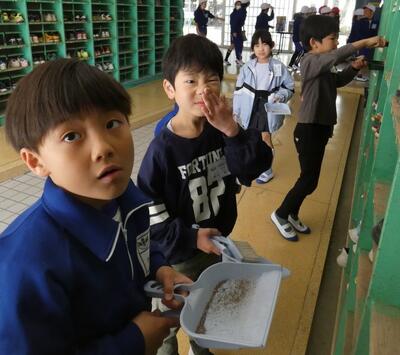 1校時の休み時間に、靴箱掃除をする2年2組の子供たち。