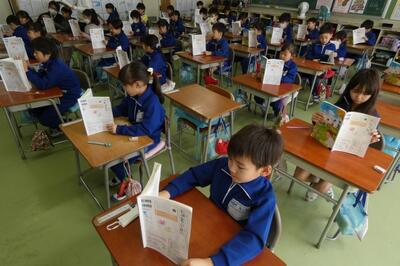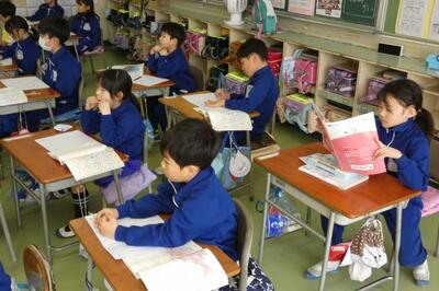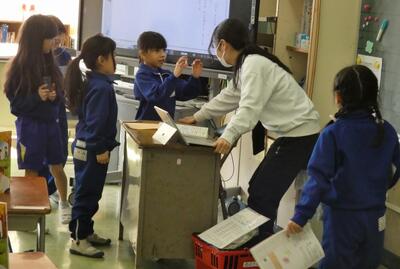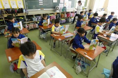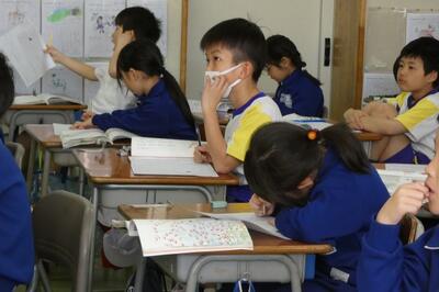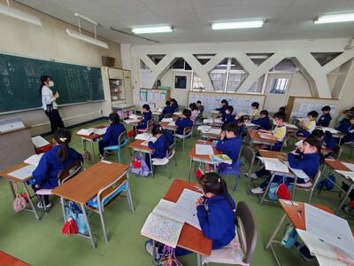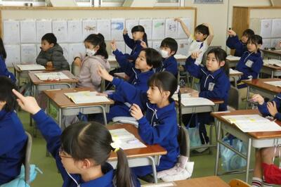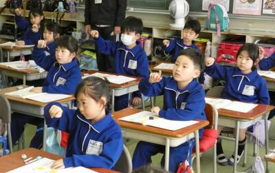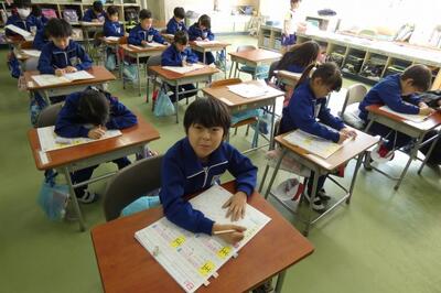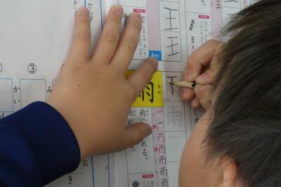 始めに、「玉」「王」「正」など、教科書の教材「スイミー」に出てくる、形が似ている漢字を練習しました。先生と一緒に空書きする子供たち。