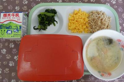 今日の給食は、三色ごはん(鶏そぼろ・卵そぼろ・ほうれん草)、玉葱とわかめのみそ汁、牛乳でした。エネルギー644kcal、たんぱく質29.7g、脂質20.5gでした。ごちそうさまでした。