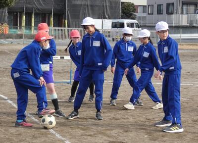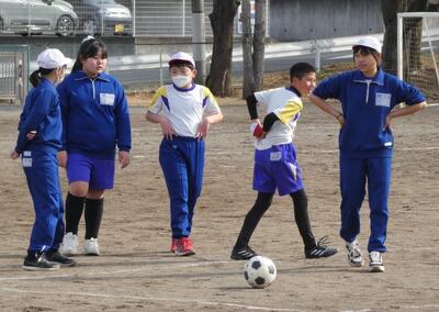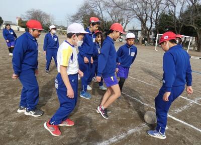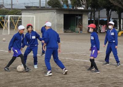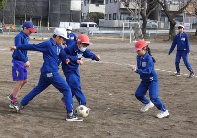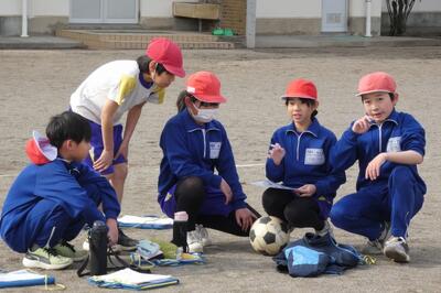 5年4組の体育科の授業におジャマしました。「サッカー」の学習も大詰めです。今日は6つのチームに分かれてゲーム練習をしました。