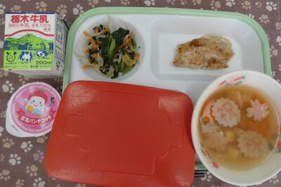 今日は、「卒業お祝い給食」でした。とり肉のしょうゆもろみ焼き、青菜のナムル、ゆば入りすまし汁、豆乳パンナコッタいちごソーズ、ごはん、牛乳をいただきました。エネルギー612kcal、たんぱく質25.0g、脂質19.5gでした。ごちそうさまでした。