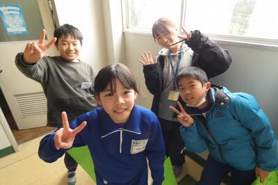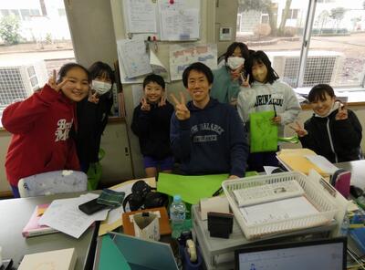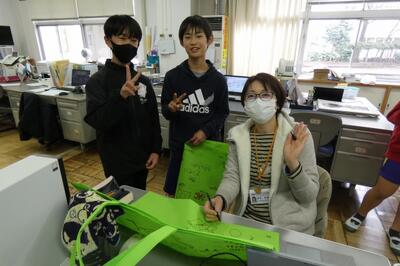 5年生が職員室の先生に、記念メッセージをもらいにやってきました。そこをパチリ。