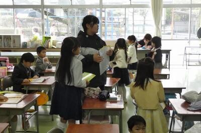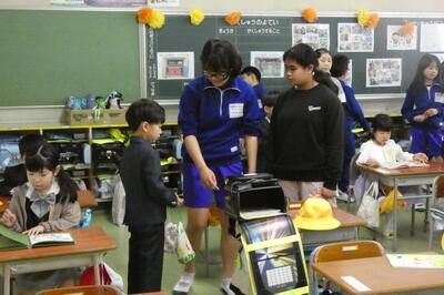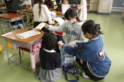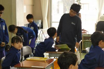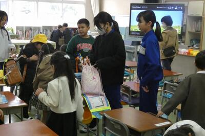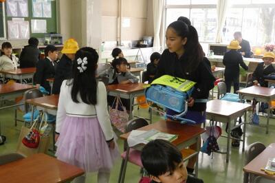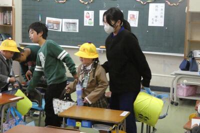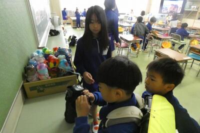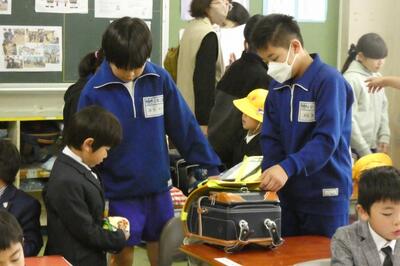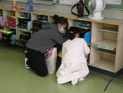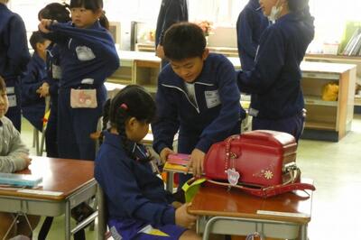 1年生が教室に着いてからは、連絡帳の提出や荷物の移動・整理整頓を、6年生が教えてくれています。 6年生の皆さん、ありがとう!!