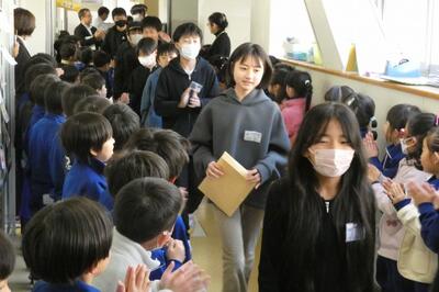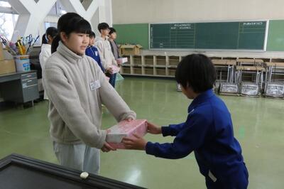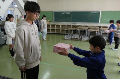 最後に、1~4年生の代表児童が6年生に、卒業式で胸に付けるリボンを贈りました。