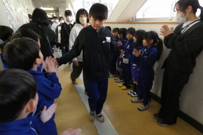 5校時、担任の先生から小学校最後の通知表をもらう6年生。