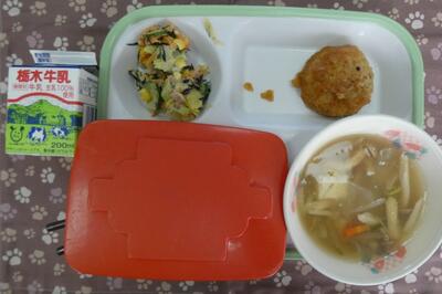 今日の給食は、豆腐ハンバーグ和風ソース、ひじきのごまドレあえ、のっぺい汁、ごはん、牛乳でした。エネルギー643kcal、たんぱく質24.6g、脂質20.5gでした。ごちそうさまでした。