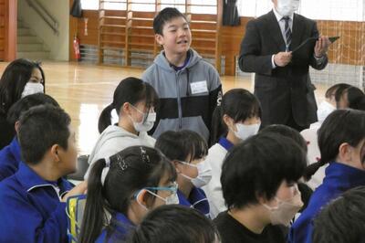 午後、中学校から先生と生徒さんをお招きして、6年生を対象に「先輩に聞く会」を開きました。今日は真岡中から2名の3年生と教頭先生と3学年の先生が来てくださり、中学校の様子を話してくれました。