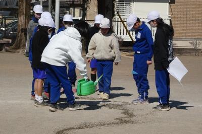 水を撒いて「へびオニ」のヘビを描く6年生。ありがとう。