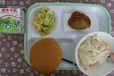 今日の給食は、ハンバーグトマトソース、コールスローサラダ、マカロニのクリーム煮、丸パン、牛乳でした。エネルギー756kcal、たんぱく質30.0g、脂質27.0gでした。ごちそうさまでした。