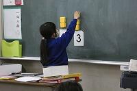 指名された児童が黒板でブロックを使って数と数字を確認していきます。