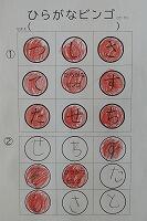 ③ひらがなビンゴでは、自分で選んだひらがなをワークシートに書き込みます。その後、カードを引いて、ひらがなを提示します。