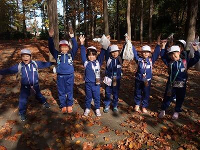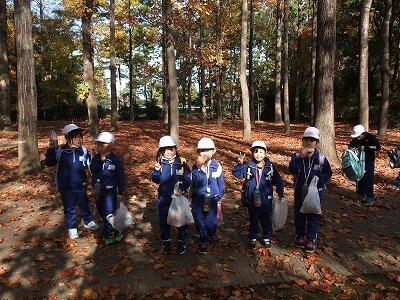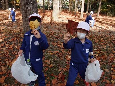 真っ赤なもみじや黄色いいちょうがとてもきれいでした。大きな落ち葉も拾ってきました。どんぐりもたくさん落ちていて、ペットボトルの口までいっぱいに拾うことができました。「楽しくてしょうがない!!」という声が聞こえました。みんなで秋を満喫してきました。学校に戻ってから、拾ってきた落ち葉を使って絵にしたり、冠を作ったりしました。今週は、拾ってきたどんぐりを使って遊ぶ予定です。