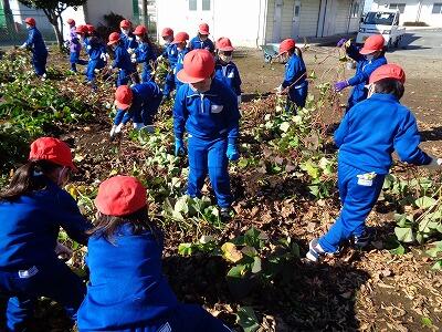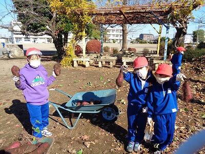 みんなで力を合わせてつるを引っ張りました。つるの先に、いくつかさつまいももついてきました。つるをとったら、シャベルで土の中のさつまいもを掘りました。おいしそうなさつまいもがたくさんとれました。みんなとても満足な様子でした。