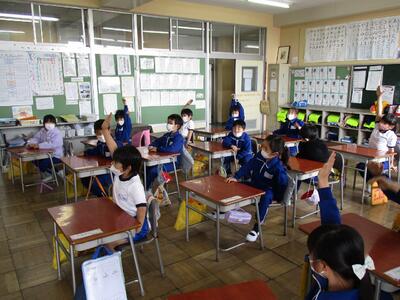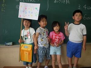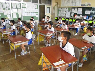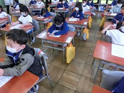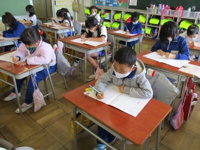 1年生にとって初めての授業参観が行われました。授業が始まる前には、「お母さんはまだかなあ」などと校庭を見たり、廊下に出て確かめたりする子どもたちの姿が見られました。授業が始まると、しっかり前を向いて一生懸命に学習していました。