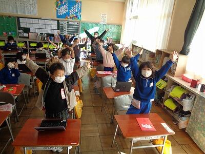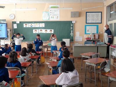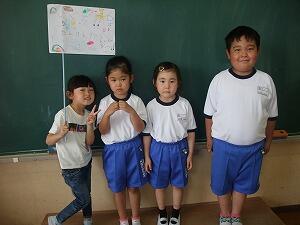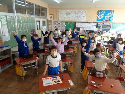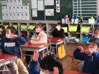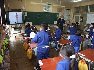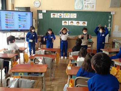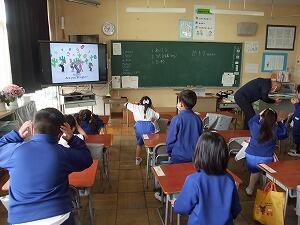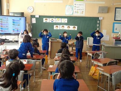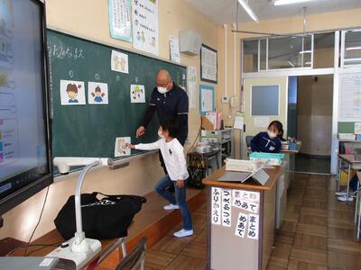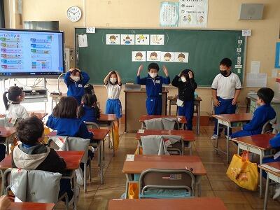 1校時に子どもたちが心待ちにしている外国語活動の学習がありました。英会話体操は、授業をやる度に上手にできるようになってきています。今日は、体の部分の呼び方を学習しました。全員、ごほうびのステッカーをいただき、喜んでいました。