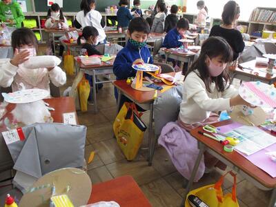 図工で「かみざらコロコロ」の学習をしました。真っ白な紙皿に飾り付けをして、きれいな作品が完成しました。その後は、体育館で競争したり、自分たちで考えて遊んだりしました。