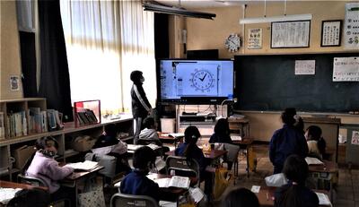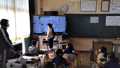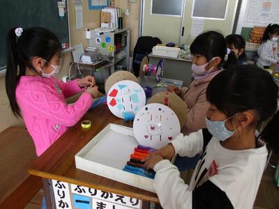 今日は、算数の時間に、時計の長針、短針を見て、何時何分という時刻を読む学習をしました。後半は、時計を読むときの5とびの数(5,10,15・・・)の活用のしかたについて話し合いました。
