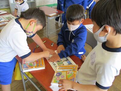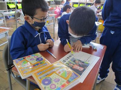 生活科で、生きものと仲良しになろうという学習をしています。生きものを捕まえたり観察したり触れたりお世話したりしながら仲良しになります。生きものの本も読んで、いろいろ調べてお世話をしています。