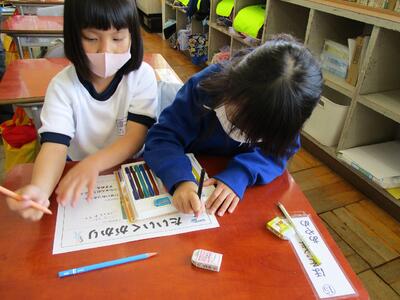 1年生だけで、学校探検をしました。特別教室はもちろん、普通教室での上級生の授業の様子も見学させていただきました。職員室や保健室、校長室も探検させていただきました。校長先生には、一人一人自己紹介をしたり、質問をしたり、最後にはサインもいただきました。学校には、たくさんの教室があることが分かりました。その中でも、音楽室が人気だったようです。今度、音楽室で授業をしてみようと思います。