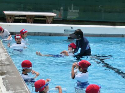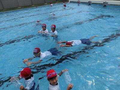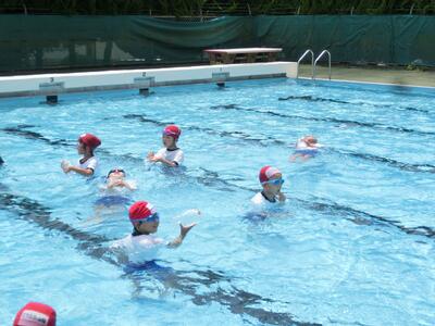 初めてプールに入ったときは、怖くて泣いている子も何人かいましたが、今ではずいぶんと慣れて、潜ったり浮いたり泳いだりできるようになってきました。