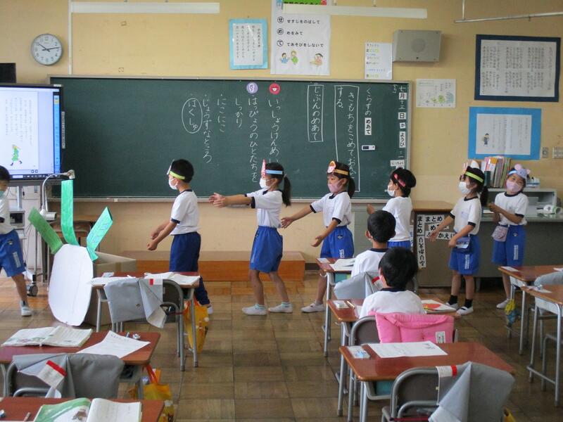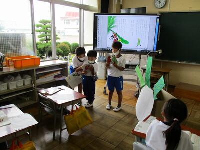 国語の時間に、音読の発表会をやりました。学力向上推進リーダーの大関先生の来校日に合わせて、子どもたちは一生懸命に練習に取り組んでいました。当日は、2つのグループに分かれ、登場人物になりきって音読したり動きをつけたりしました。どちらのグループも、本番では上手に音読ができ、3ヶ月間の成長をしみじみ感じた1時間でした。